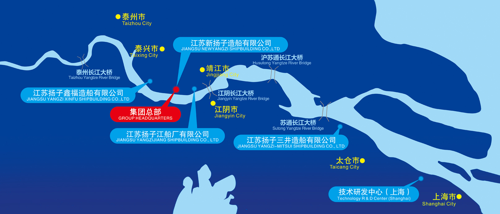 集團(tuán)公司下轄江蘇新?lián)P子造船有限公司、江蘇揚(yáng)子鑫福造船有限公司、江蘇揚(yáng)子三井造船有限公司及江蘇揚(yáng)子江船廠有限公司4家造船企業(yè),分布于長(zhǎng)江下游江蘇省境內(nèi)的靖江市、泰興市和太倉(cāng)市的黃金水道兩岸,距上海、南京兩大城市均170公里。