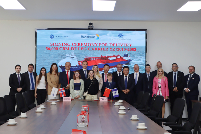 7月9日,Ocean Yield COO Andreas Reklev先生及我集團(tuán)副總經(jīng)理兼揚(yáng)子三井總經(jīng)理宋書明先生代表雙方簽署交船文件。