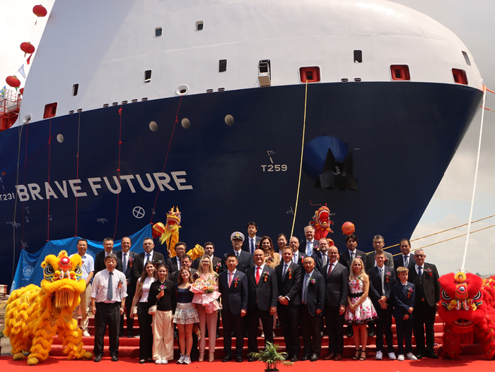 揚(yáng)子三井代表宋書明先生表示:“繼今年1月“Brilliant Future”號(hào)成功交付后,我們迎來了第二艘雙燃料LEG運(yùn)輸船的交付。值此機(jī)會(huì),我們衷心感謝Braskem的Cristiane女士、Hardi先生,以及Ocean Yield的Andreas先生。感謝Hartmann集團(tuán)的Hartmann博士、Adami船長、Ionut Cornea先生、龍葉飛先生,感謝AC-INOX的Sascha先生。感謝整個(gè)Hartmann團(tuán)隊(duì)始終如一的支持,也感謝DNV船級(jí)的專業(yè)指導(dǎo)。同時(shí),向所有參與本船建造的YAMIC員工致以誠摯謝意。未來,我們將繼續(xù)與各方緊密合作,為船東研發(fā)建造更加安全、更加綠色、更高性能的綠色能源氣體運(yùn)輸船產(chǎn)品。”教母Cristiane Rego女士為新船命名并擲香檳禮,現(xiàn)場(chǎng)鞭炮齊鳴、禮花綻放,汽笛共鳴,龍獅共舞,祝福新船和船員航行平安,勇敢前行,為船東和租家?guī)砗眠\(yùn)與財(cái)富,也為Hartmann、DNV和揚(yáng)子三井贏得榮耀,帶給所有人勇氣與希望。Hartmann代表Adami Ulrich表示:“衷心感謝揚(yáng)子三井團(tuán)隊(duì)。揚(yáng)子三井憑借嚴(yán)謹(jǐn)?shù)墓芾砗椭苊艿挠?jì)劃,確保了本船的順利交付。我們對(duì)揚(yáng)子三井未來的發(fā)展充滿信心,也感謝所有為此付出努力的員工?!?/span>Braskem代表Hardi Schuck表示:“正是由于揚(yáng)子三井在船舶建造過程中的專業(yè)精神與奉獻(xiàn),讓我們對(duì)Brave Future感到無比自豪。”