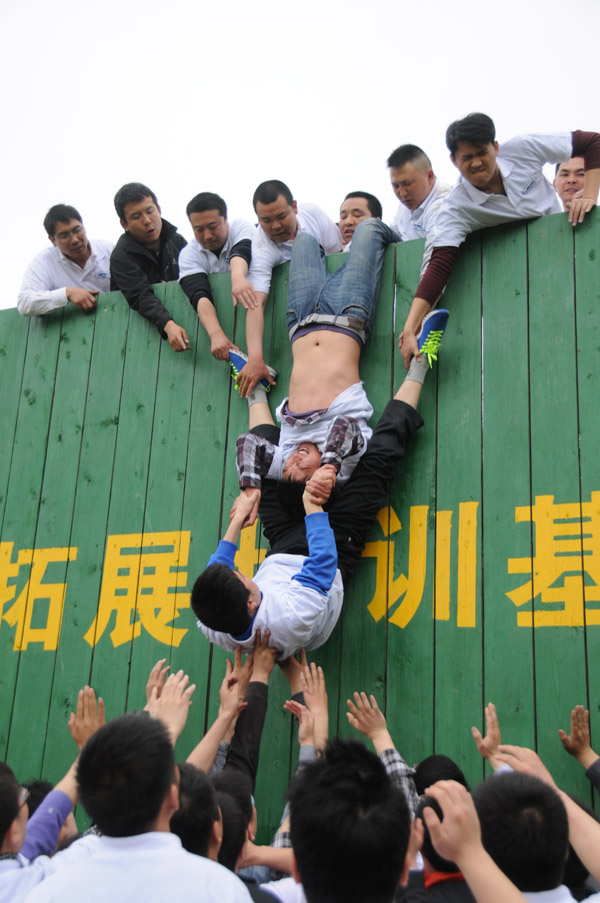 下午的拓展項目更是“體驗升級”,“卓越圈”項目讓人意識到從優(yōu)秀到卓越不是一蹴而就的,是一個曲折的過程,是一個不斷超越的過程,在一輪一輪挑戰(zhàn)5.4秒這個終極時限的過程中,我們的年輕干部們磨傷了手、劃傷了臉、蹲酸了腿,任灰塵在身邊沸騰,任汗水在臉上流淌,他們都沒有退縮一步,不斷的嘗試、改進、再嘗試、再改進,最終,5.21秒這個卓越的成績被記錄在了成績冊上,大家歡呼雀躍。到了最后的挑戰(zhàn)了,“畢業(yè)墻”垂直立于地面,沒有輔助設施,沒有輔助人員,大伙兒覺得需要1.5小時這47名學員才能全部翻過這面墻——4.2米高的墻。按照教練的指導,做基礎的、做輔助的、做保護的、做拉手的,自發(fā)輪流上陣,伙伴們一個一個互相拉扯著翻越了畢業(yè)墻,他們中有人肩膀被踩破了,有的肌肉僵硬了,有的手臂勒紫了,但都沒有吭一聲,只想著讓所有的伙伴全都快速翻過墻,堅持不懈的精神在他們中不斷傳遞著……終于他們創(chuàng)造了一個自己都沒敢想的奇跡,15分49秒51,所有47人全部完成了翻越!