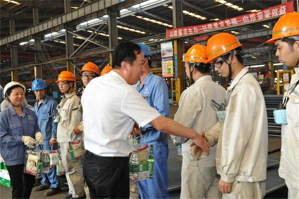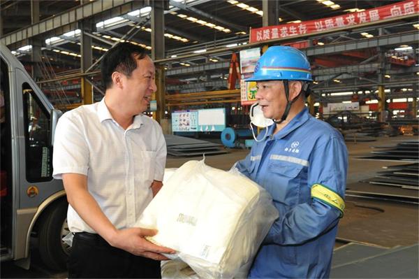 胡榮華副主席帶隊慰問了在高溫下堅守工作崗位的新?lián)P子加工車間員工,給他們送去防暑降溫物品,他代表市委、市政府向頂著烈日奮戰(zhàn)在一線的全體工友表示慰問。之后,市總領(lǐng)導一行還對我集團上半年度工會工作進行了調(diào)研。在聽取工會王主席對我司上半年主要的工會工作和職工活動介紹后,胡副主席用“四個有”評價了我們的工作,即“企業(yè)發(fā)展有條不紊、工會工作井井有條、活動開展有聲有色、服務職工有心有愛”當天,市總共為我們送來了400條毛巾和5箱礦泉水的慰問品。