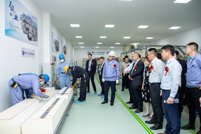 On the morning of September 26, the unveiling ceremony of Yangzijiang Shipbuilding Group LNG MARK III Training Center was held in Yangzi Xinfu Shipyard. Mr. Matthew, China Manager of CMA CGM, Mr. Alexander, Business Department Key Account Manager of GTT Headquarters, Mr. Chen Biao,  Vice President of BV China and other guests were invited to attend the ceremony. Mr. Zhou Kewei, Deputy General Manager of the Group, and other leaders were present.