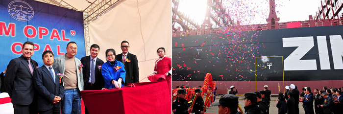 蔡霞女士將新船命名為“ZIM OPAL”輪,為新船砍纜并擲香檳禮,拉響汽笛,祝福新船、隨船船員航行平安,為船東和租家?guī)?lái)榮譽(yù)和財(cái)富。在“ZIM OPAL”輪首任船長(zhǎng)的陪同下,參加儀式的嘉賓興致勃勃地登船參觀。