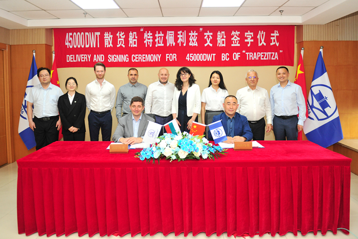 5月30日下午,在各方代表的共同見證下,NAVIBULGAR執(zhí)行董事Alexander Kalchev先生,我集團(tuán)副總經(jīng)理吉宏飛先生分別代表雙方簽署交船文件,NAVIBULGAR 45000DWT散貨船“TRAPEZITZA”輪順利交付。