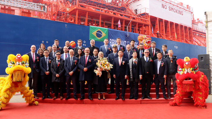 On the morning of January 14th, Yang-zi Mitsui Shipbuilding held a grand naming ceremony for the vessel. Ms. Silvia Pires Migueles, the godmother of the vessel, named the vessel and tossed champagne. The signing and delivery ceremony of "BRILLIANT FUTURE", the first dual-fuel LEG carrier built by Yang-zi Mitsui, was also completed on the same day of the naming ceremony.